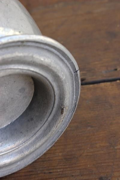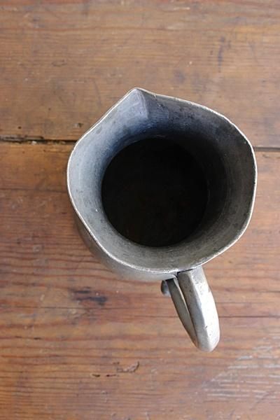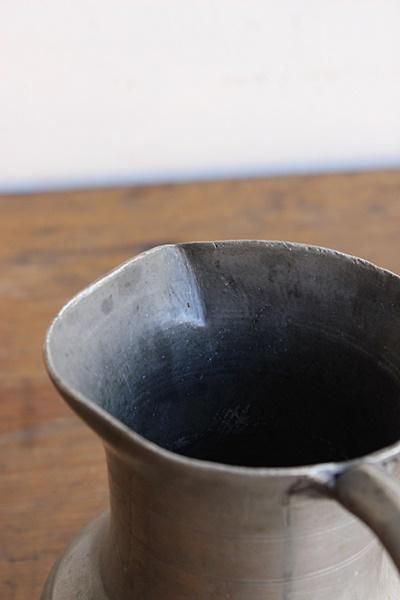 歪みや傾きが個性的なピューター製のピッチャー。